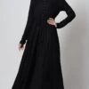 Featuring a graceful and sophisticated fully covered abaya dress in cotton corduroy base adorned with contrast color black thread embroidery on the neckline and wide panel around the bottom hem. It has an A line silhouette and flared loose sleeves. It is a beautiful and elegant contemporary ensemble perfect to be worn for casual ocassions.