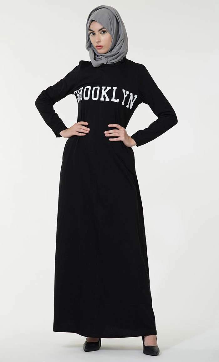 Featuring a casual modest wear fully covered muslimah abaya dress in cotton jersey fabric handpainted beautifully with a slogan at the centre ‘Brooklyn’. It has round neckline, simple sleeves and pockets on both sides of the front A line silhouette bottom skirt. Its a basic everyday wear ensemble perfect to be worn for casual ocassions.