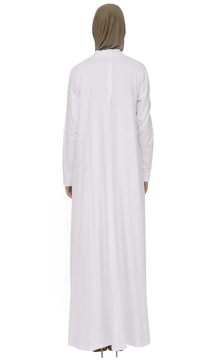 Featuring an ethnic and traditional style abaya dress in cotton jersey base crafted with wide and broad pockets on the sides of the front for the comfortable casual wear look.