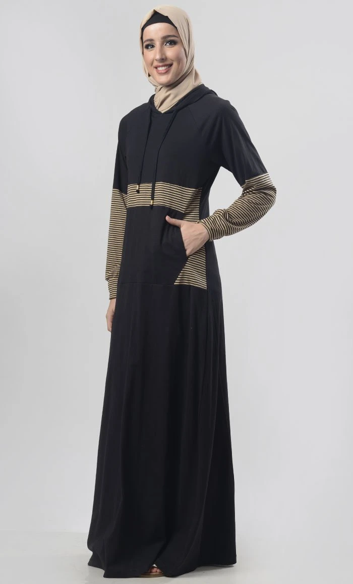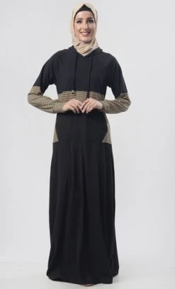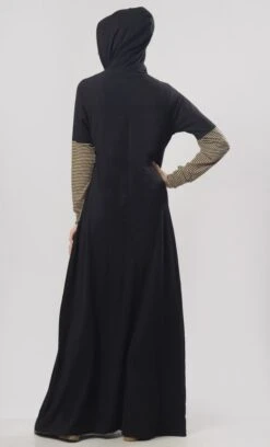 This abaya has class and modesty and features with detailing on the bodice and round neck hoodie style and attached dori in hoodie cap, basic full sleeves with stripes detailing and beautiful stripes detailing on bodice also to eccentuate its design. The abaya is perfect for casual wear.