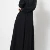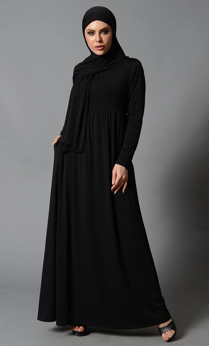 Featuring a casual everday wear muslimah abaya dress in korean polyester jersey fabric with knife pleated panels around the flared bottom skirt along with gathers detailing on the neckline. It is slighlt fitted around the waist with plain sleeves and round neckline. Its a casual ensemble that can be accessorized to make it look trendy and modern.