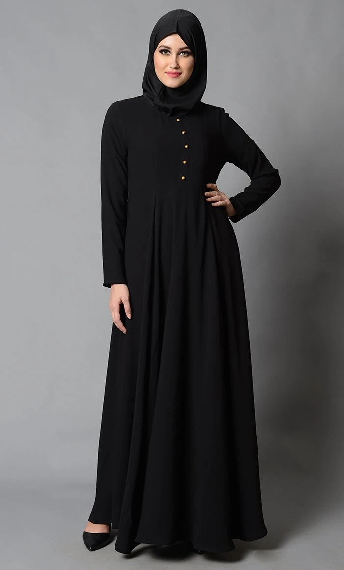 Featuring a casual fully covered abaya dress in Nida base with an A line pleated panels comfortable slip on silhouette, round neckline and pockets on the sides. It is highlighted with loop buttons detailing at the centre front of the bodice. Its a modest wear basic and comfortable everyday wear abaya dress and a must have statement piece.