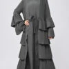 Featuring a casual winter wear fully covered hoodie style muslimah abaya dress in cotton polyester blend base with a hoodie at the back along with knotted tie up string that is adjustable according to shape of the face. It is further highlighted with an elasticated drawstring detail around the wiast and pockets on both sides of an A line skirt.