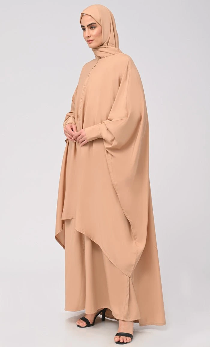 It has a double layer, front zipper, full sleeves, included hijab and included pockets on lining