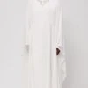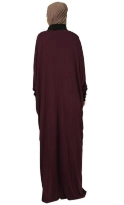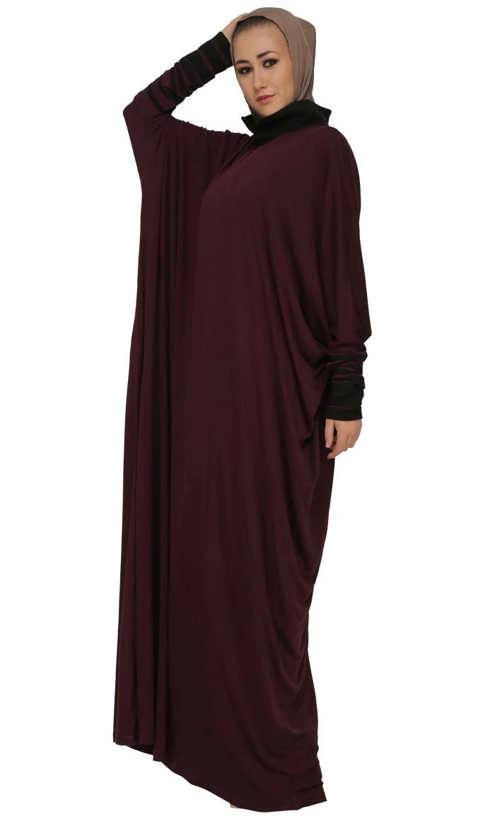 Featuring a kaftan style loose silhouette abaya dress in viscose jersey base adorned with black striped panels on the batwing sleeves. The simplicity of the look adds to the contemporary and comfortable styling of an ensemble.