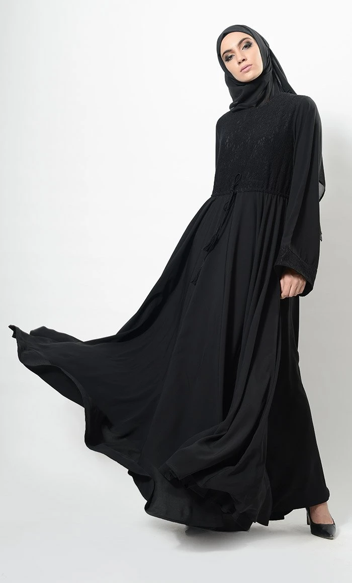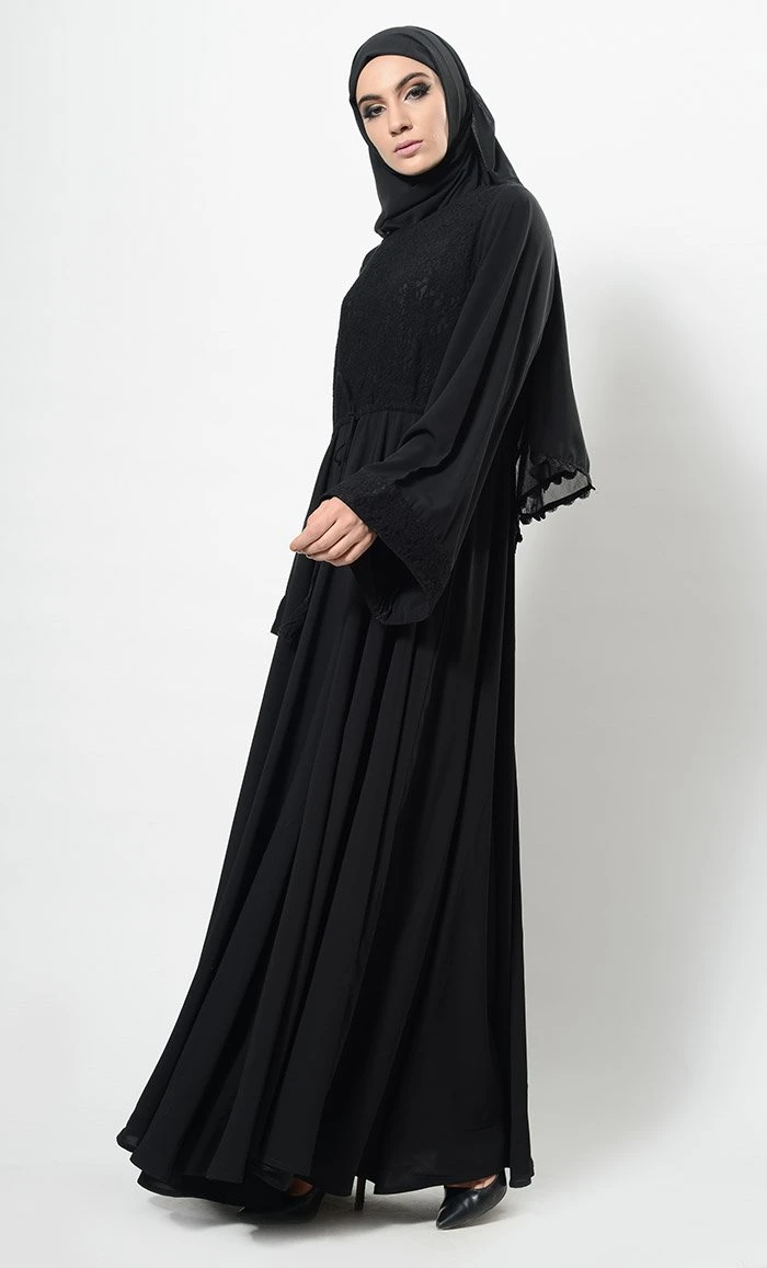 Featuring a beautiful modest wear flared abaya dress in nida basie adorned with self woven floral lace panel covering the top of the bodice and edges of bell style loose sleeves. It has drawstring detailing around the waist and is comfortable to be worn both for informal and formal ocassions.