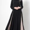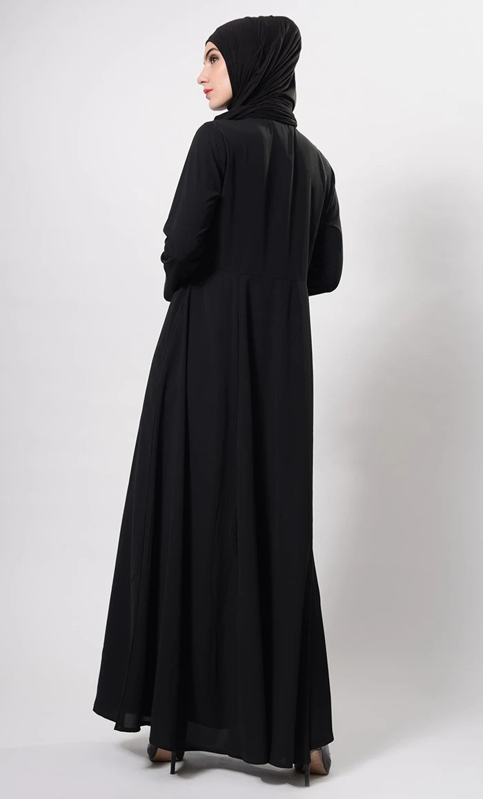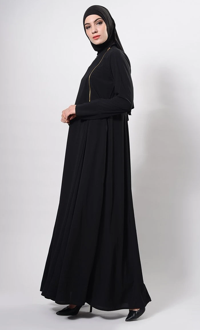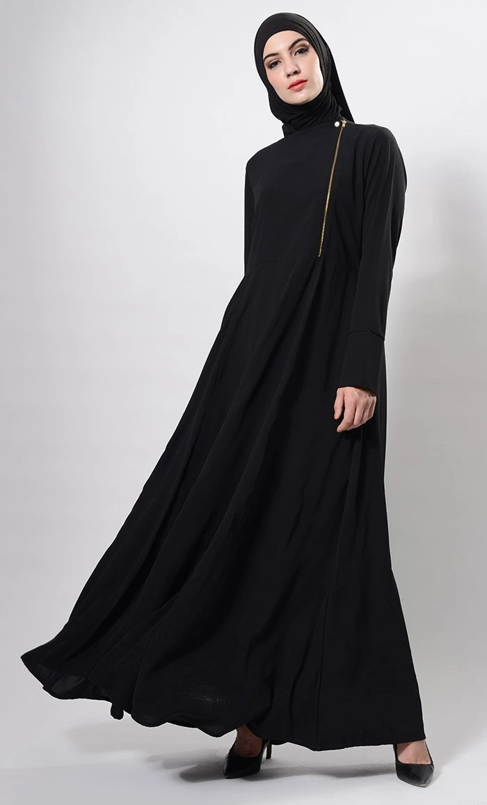 Featuring a casual high collared muslimah abaya dress in nida fabric adorned with metallic zipper closure detailing placed at the side of yoke along with princess seams on the sides. It has pockets on the sides and A line loose silhouette perfect for daily wear.