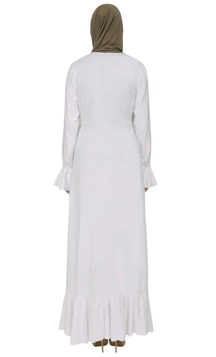 Featuring a wrap around abaya dress in cotton jersey base adorned with pleated ruffle detailing around the bottom skirt in diagonal pattern. It is accentuated with drop waist ruffled hem to give more arabian look to an ensemble.