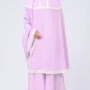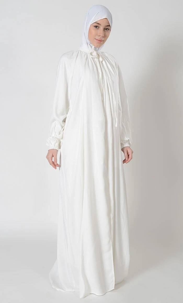 Featuring a loose silhouette modest wear muslimah hajj abaya dress in rayon fabric highlighted with knotted tie up detailing around the neckline which is adjustable. It has loose sleeves with an elasticated tightened edges at the wrist and flared panels all over the front and back. It is a front open shrug style abaya.