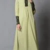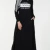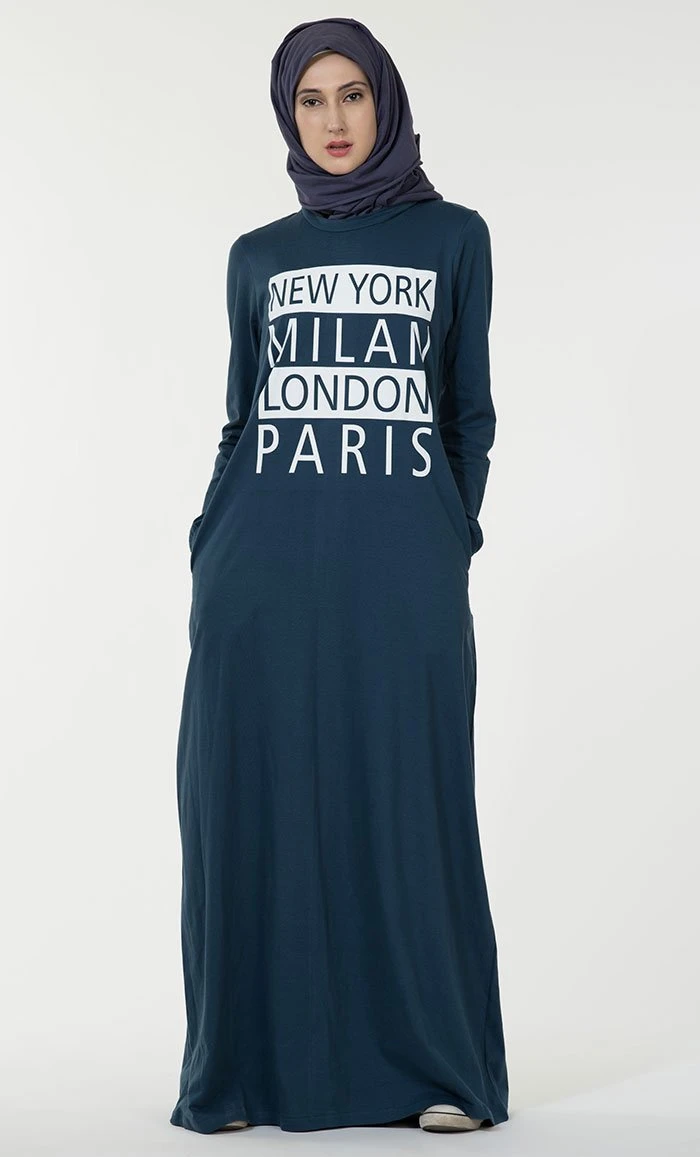 Featuring a casual modest wear fully covered muslimah abaya dress in cotton jersey fabric handpainted beautifully with a slogan at the centre ‘New York Milan London Paris’. It has round neckline, simple sleeves and pockets on both sides of the front A line silhouette bottom skirt. Its a basic everyday wear ensemble perfect to be worn for casual ocassions.