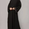 Featuring a basic everyday wear abaya dress in kashibo fabric highlighted with pleated panel on the front and slightly A line silhouette. It has puffed sleeves with buttoned cuffs perfect to be worn as a casul abaya on daily basis.