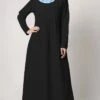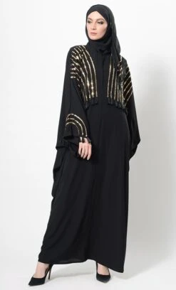 Featuring a kimono style flared abaya dress in nida fabric adorned with gold sequinned panels the all over the front bodice till the waist and sleeves. It is accentuated with thread fringes detail at the edges of sleeves and front embroidery. It has a loose silhouette perfect to be worn for evening wear ensemble.