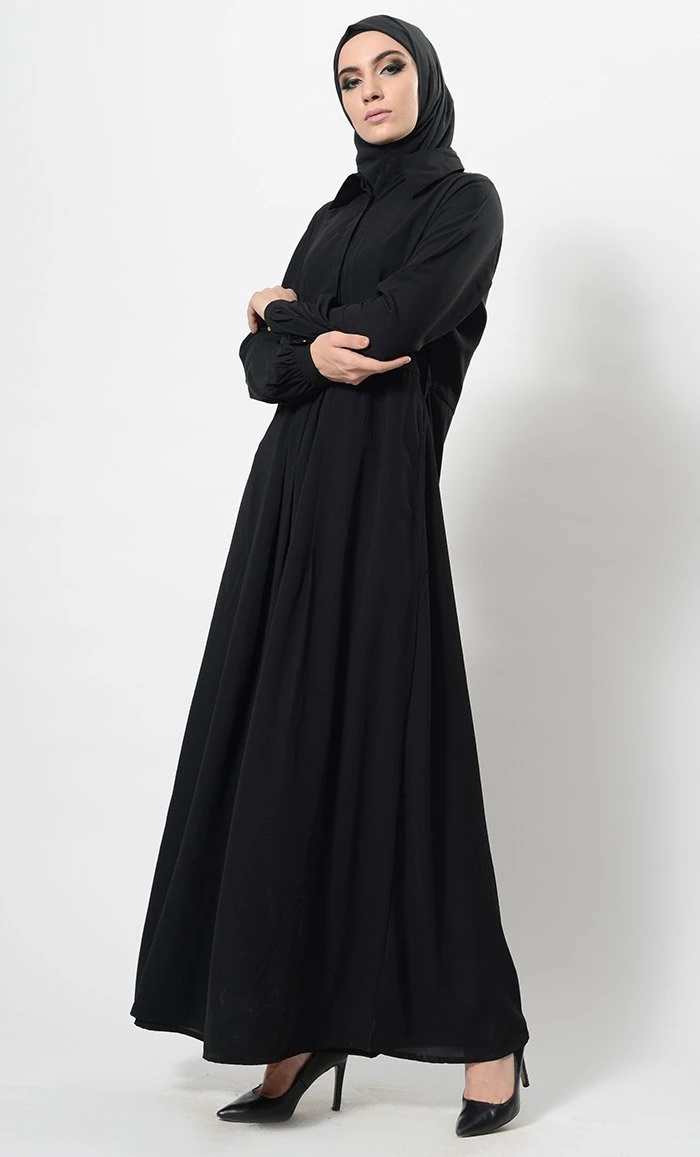Featuring a casual everyday shirt style abaya dress in nida base with hidden overlapping button closure placket at the centre front. Its a simple muslimah abaya with bishop style sleeves and A line silhouette perfect to be worn daily for informal ocassions.