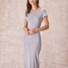 This Knit Midi Dress is made of Viscose, Nylon and Polyester. Viscose (aka rayon) is a man-made cellulosic fiber made from wood pulp. It’s soft, breathable, durable, and moisture-wicking. Nylon is a flexible synthetic fiber, waterproof, and can take rubbing and scraping without wearing away. Polyester is an artificial fiber that feels soft, looks lustrous, and dries fast.