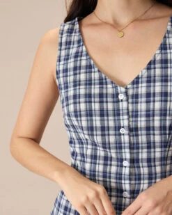Crafted from soft, breathable cotton, this dress features a flattering V-neckline and a button-down front, adding a touch of vintage elegance. The timeless blue plaid pattern enhances its casual appeal, while the midi length offers a perfect balance between comfort and sophistication.