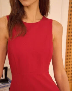 Crafted from premium quality fabric, this sleeveless mini dress ensures a comfortable and flattering fit. Its vibrant red hue is complemented by a sophisticated boat neck, offering a timeless silhouette with a modern twist.