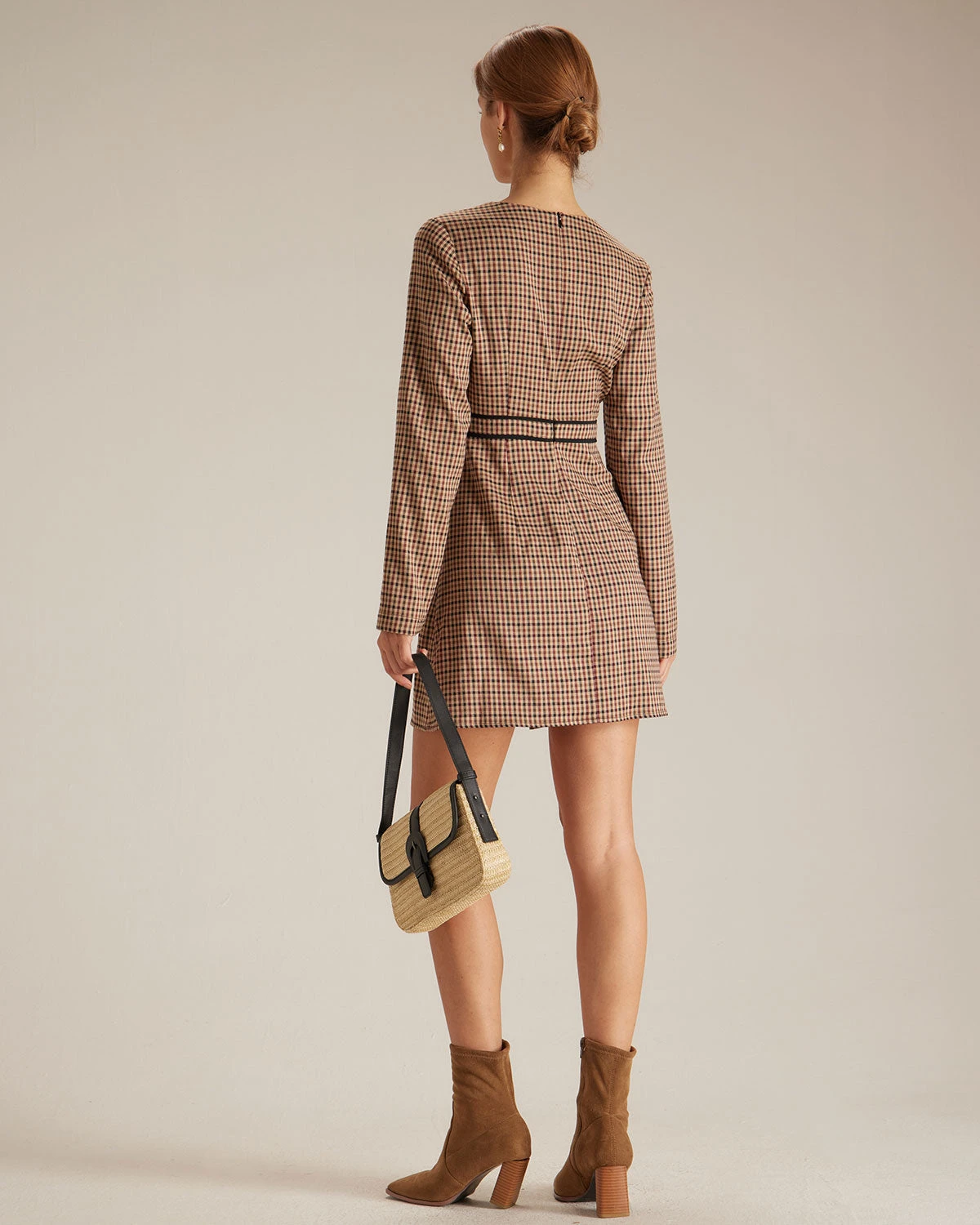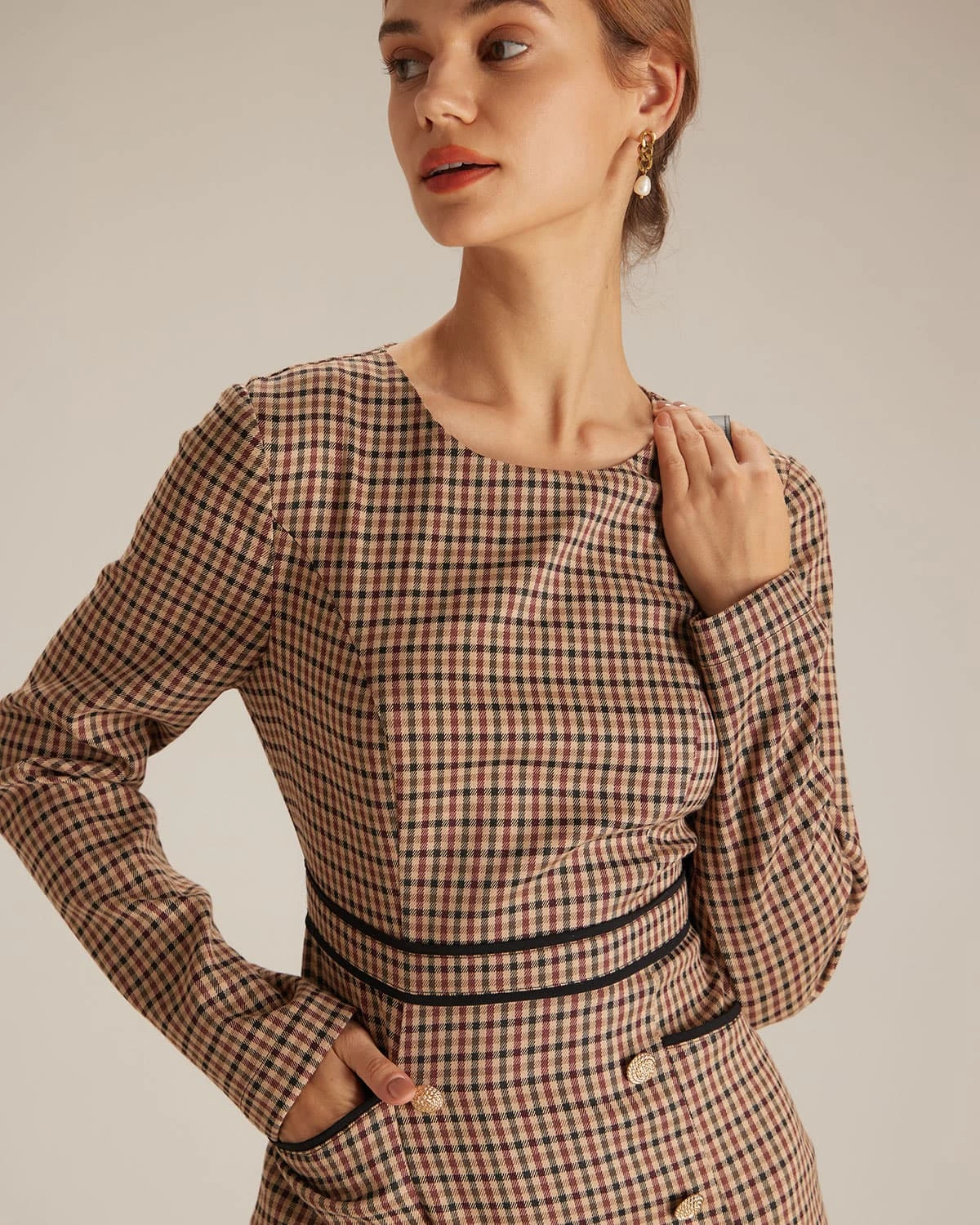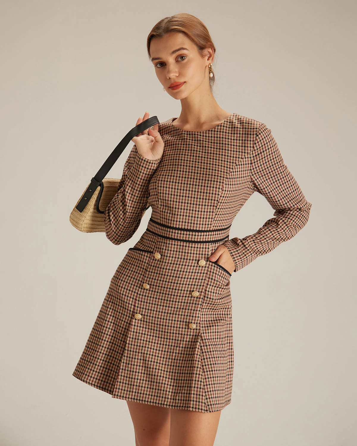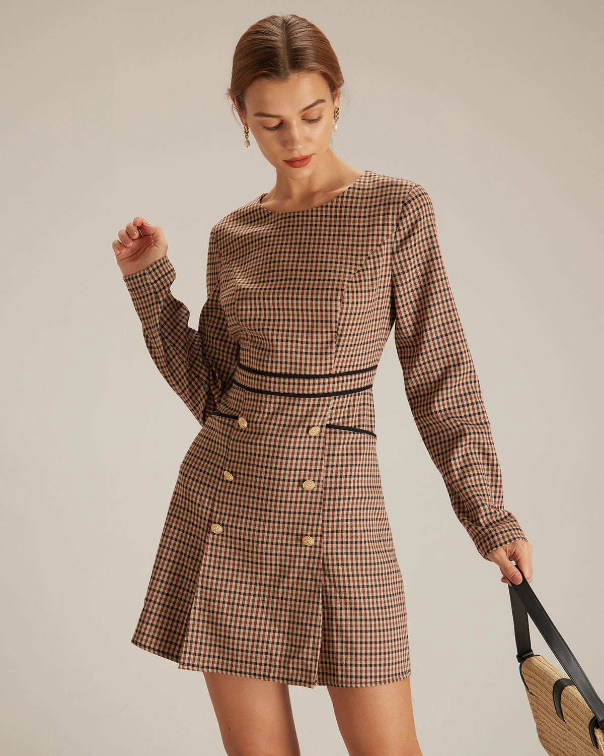 The Brown Round Neck Plaid Button Mini Dress