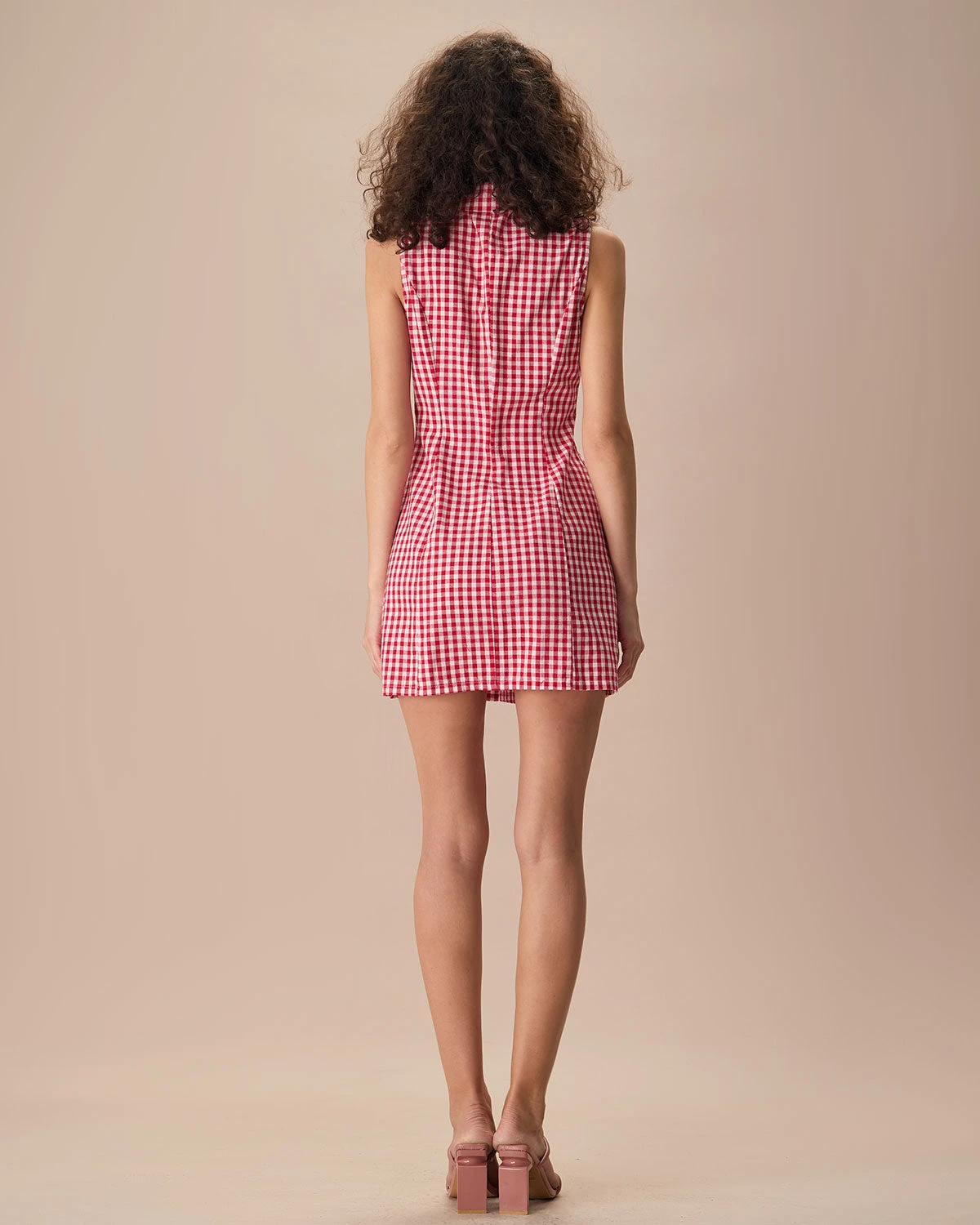 Crafted from breathable cotton, this mini dress features a timeless plaid pattern and a sharp lapel collar that adds a touch of sophistication. The sleeveless design makes it perfect for warm weather, while the fitted silhouette ensures a flattering fit.