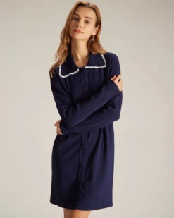 This Sweater Mini Dress is a stunning and elegant dress that is perfect for any occasion. The peter pan vollar and straight deisgn adds a touch of sophistication to the dress, while the button and lace trim deisgn add a unique and eye-catching element. The natural waisted, medium stretch and regular fit make it comfortable and easy to wear, while also creating a flattering silhouette that accentuates the figure.