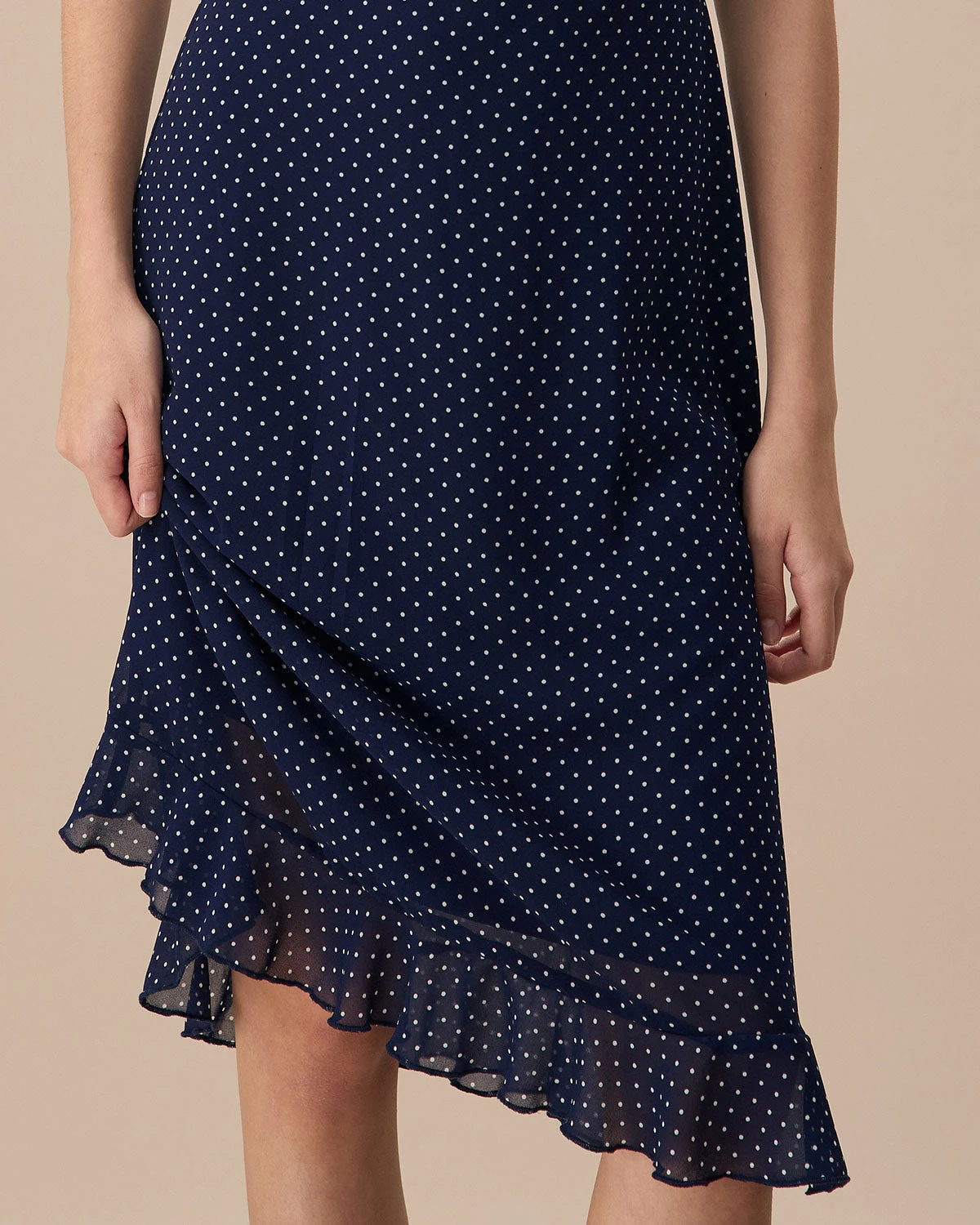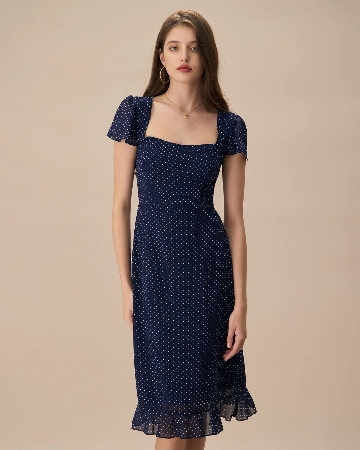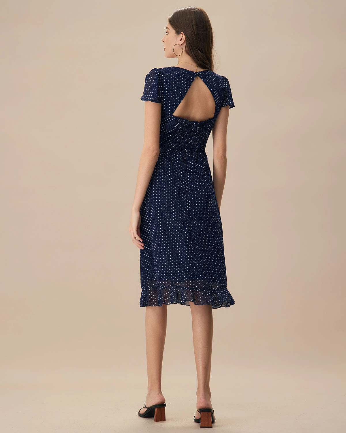 Featuring a timeless navy hue adorned with playful polka dots, this dress is perfect for a variety of occasions, from casual daytime outings to elegant evening events. The midi length provides a flattering silhouette, while the strategic cutouts add a touch of contemporary edge.