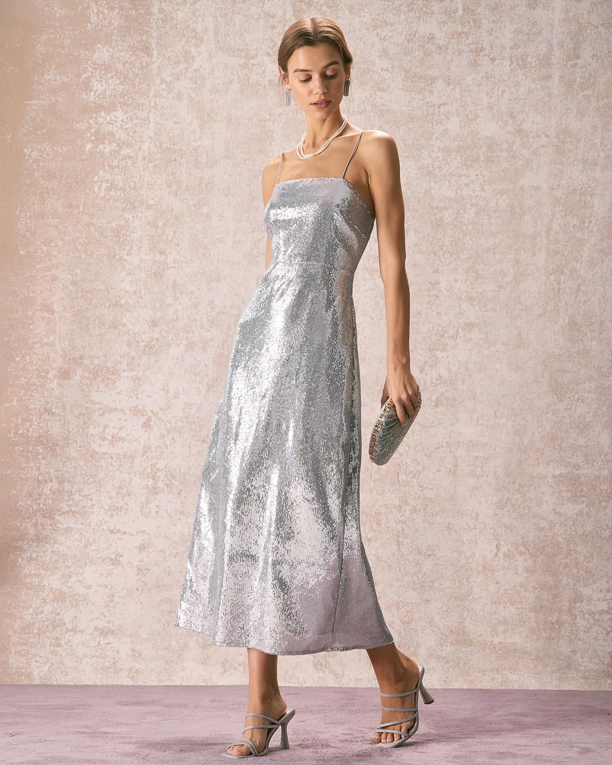 The Silver Sequin Sleeveless Strap Maxi Dress