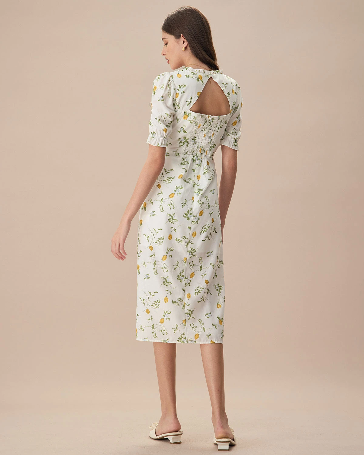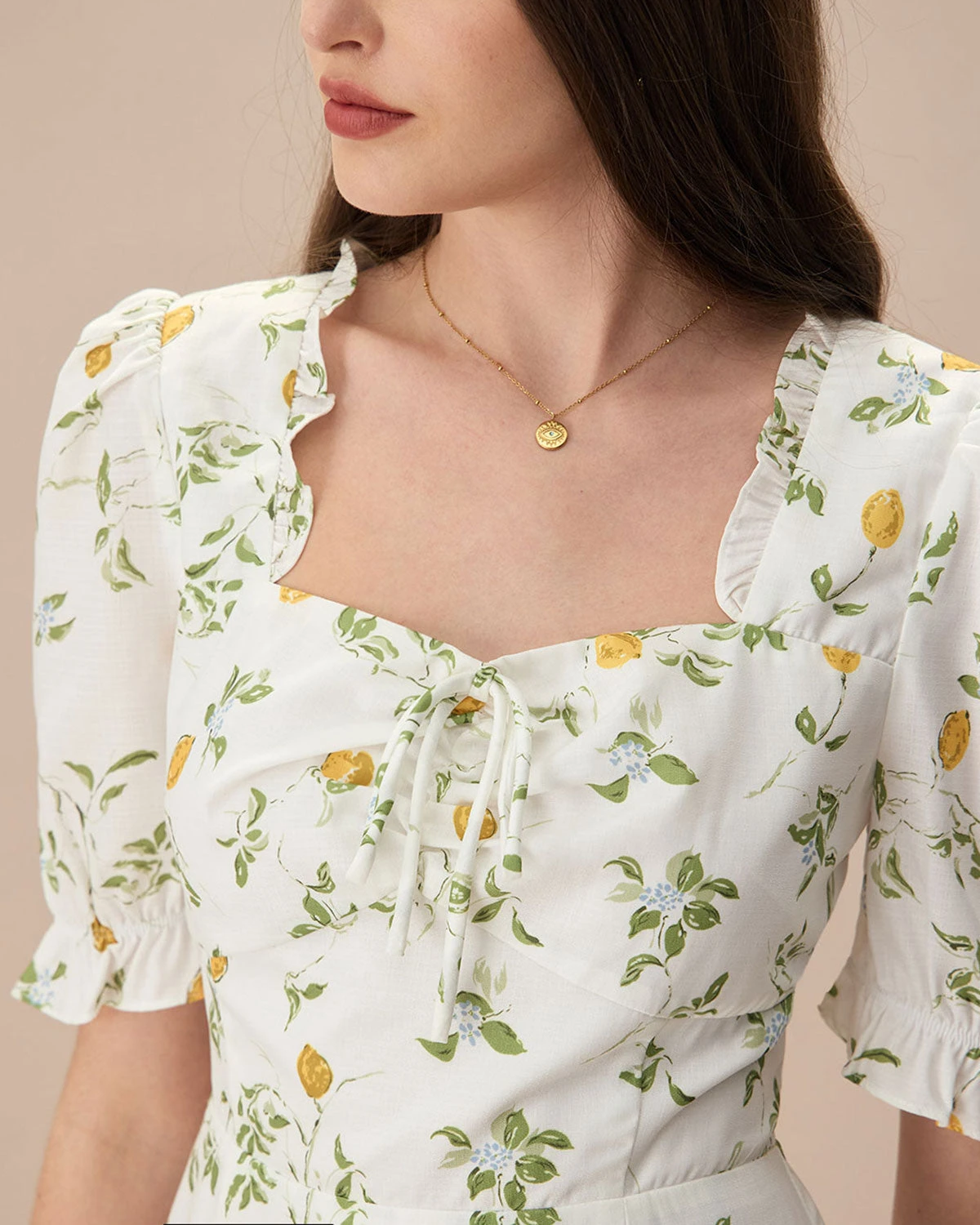 This dress features a delicate floral print on a crisp white background, accentuated by a flattering square neckline and playful frill trim details. The midi length offers a sophisticated silhouette, ideal for both casual and semi-formal events.