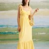 This delightful dress features a delicate ruched design that enhances its flattering fit, while the slip style ensures a graceful flow with every step. Adorned with a vibrant floral pattern, it’s the perfect choice for garden parties, brunches, or any event where you want to radiate sunny cheer.