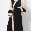 Featuring a beautiful modest wear traditional abaya dress in polyester kashibo fabric adorned with thread embroidery on the neckline, bottom hem and edges of sleeves. It has very low slits on the sides with a comfortable slip on look to an ensemble.