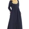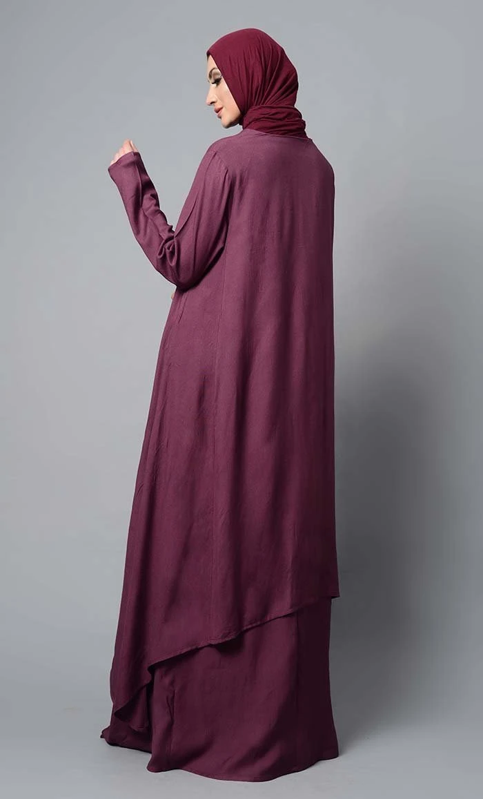 Featuring a beautiful and modest wear fully covered muslimah abaya dress in rayon fabric adorned with golden accents loop button closure placket at the centre front. It is further highlighted with simple full sleeves, round neckline and an asymmetrical and pleated high low overlayered flared top on the top of the bottom underlayered skirt. Both of them are attached from inside. It adds a contemporary and comfortable delicate look to an ensemble perfect to be worn for hajj visits, prayers meeting or for casual ocassions.
