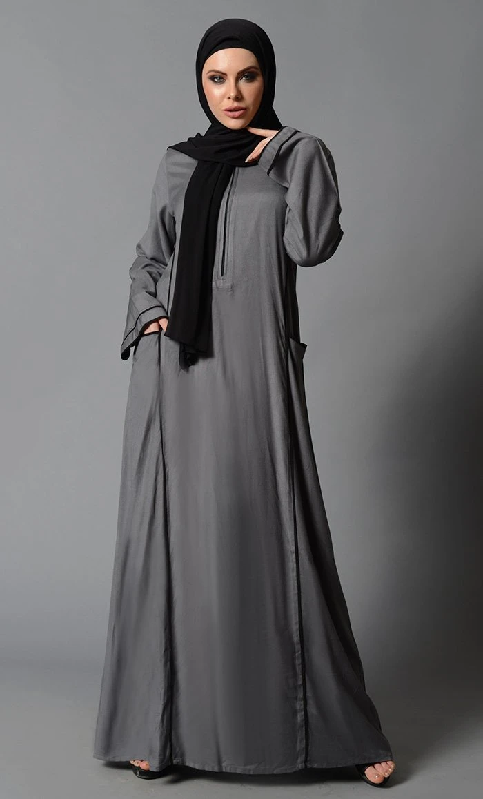 Featuring a baisc fully covered muslimah abaya dress in cotton rayon base with contrast color piping on the neckine and edges of sleeves further highlighted with metallic zipper closure detailing at the centre. It has pockets on both the sides perfect to be worn as the most basic everyday wear abaya dress.